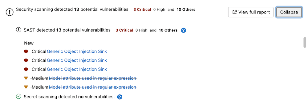 A merge request contains a security widget which displays a summary of the NEW results. New results are determined by comparing the current findings against existing findings in the target (default) branch (if there are prior findings).