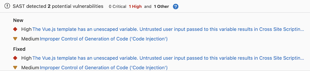 If you're using GitLab CI/CD, you can use Static Application Security Testing (SAST) to check your source code for known vulnerabilities. If the pipeline is associated with a merge request, the SAST analysis is compared with the results of the target branch's analysis (if available). The results of that comparison are shown in the merge request. If the pipeline is running from the default branch, the results of the SAST analysis are available in the security dashboards.