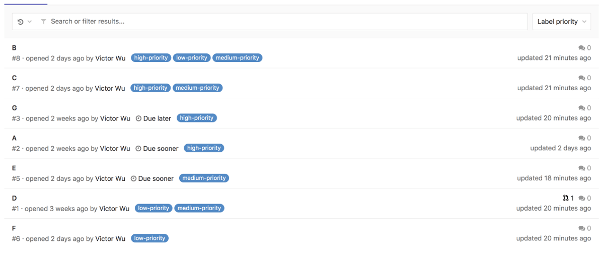 NOTE: Priority sorting is based on the highest priority label only. This discussion considers changing this.